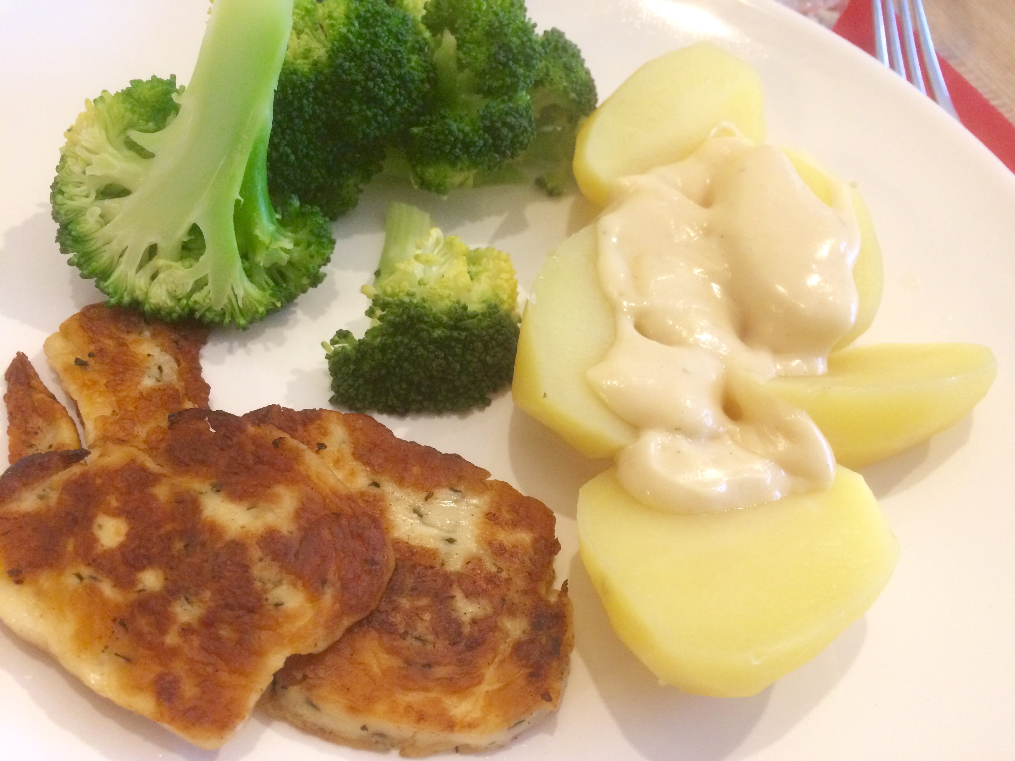 Gestern voll veggie: Gedünsteter Brokkoli und gekochte Kartoffeln mit falscher Sauce Hollandaise. Dazu gebratenen Haloumi.