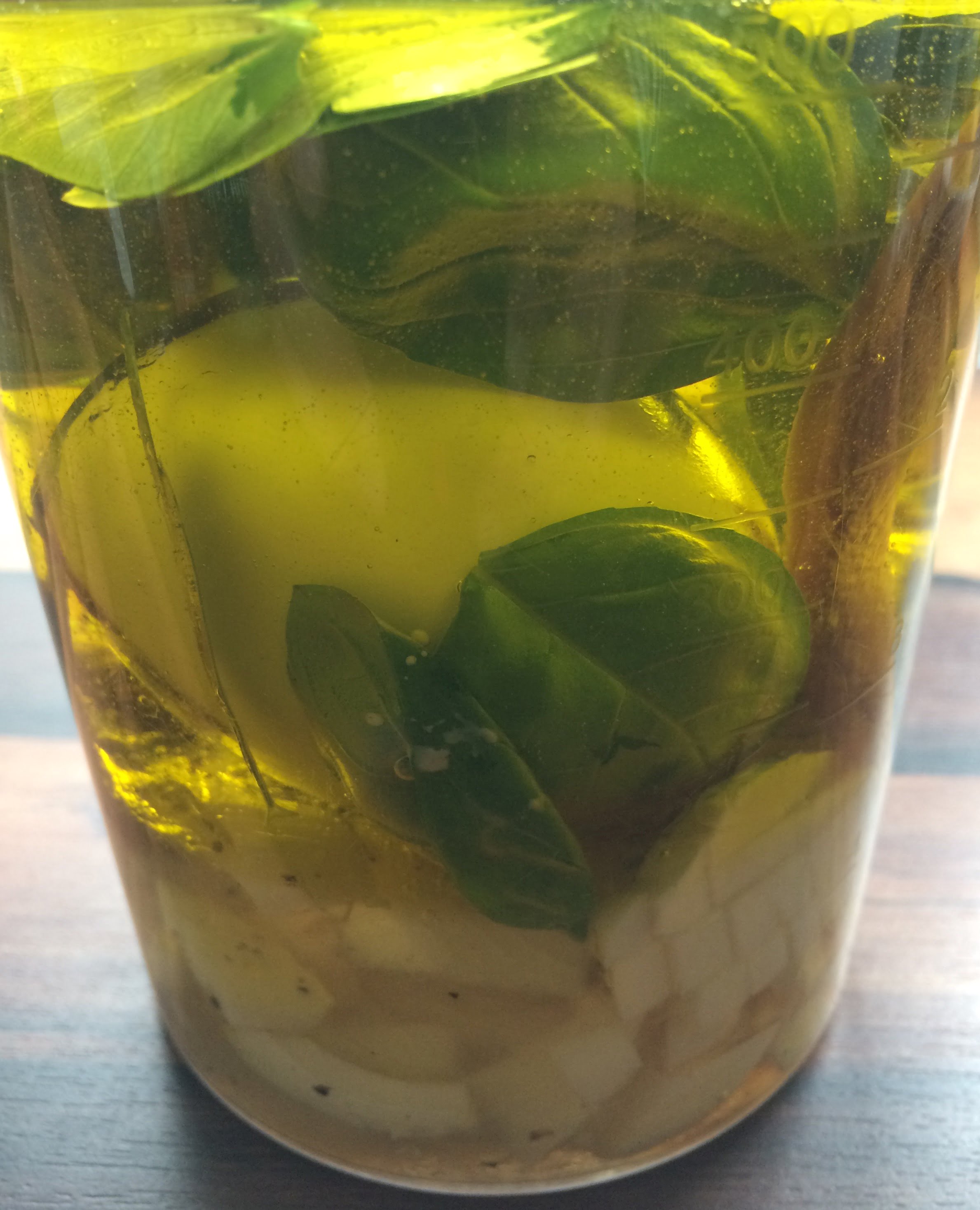 Vinaigrette Olivenöl, Acetto di Balsamico Bianco, Zitronensaft, Zwiebel, Knoblauch, Ei, Sardellen, Liebstöckel, Basilikum, Honig, Senf, Salz, Pfeffer