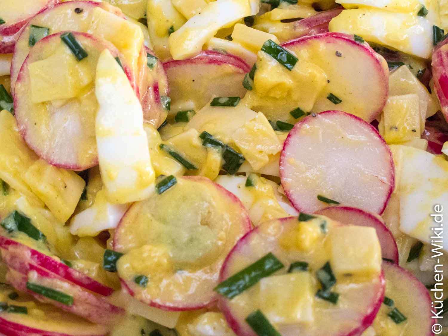 - Radieschen, Gouda, Eier, Essig, Öl, Senf, Schnittlauch, Pfeffer, Salz