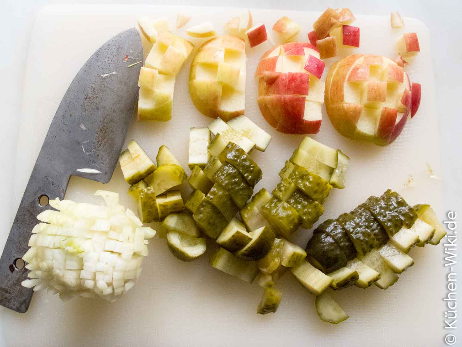 Bei den restlichen Zutaten finde ich eine homogene Größe der Einzelteile ganz attraktiv im Mund. Ich orientiere mich da immer an der Größe der Gurken. Je nach dem ob ich Cornichons oder Gewürzgurken verwende wird der Salat feinstückiger oder gröber.