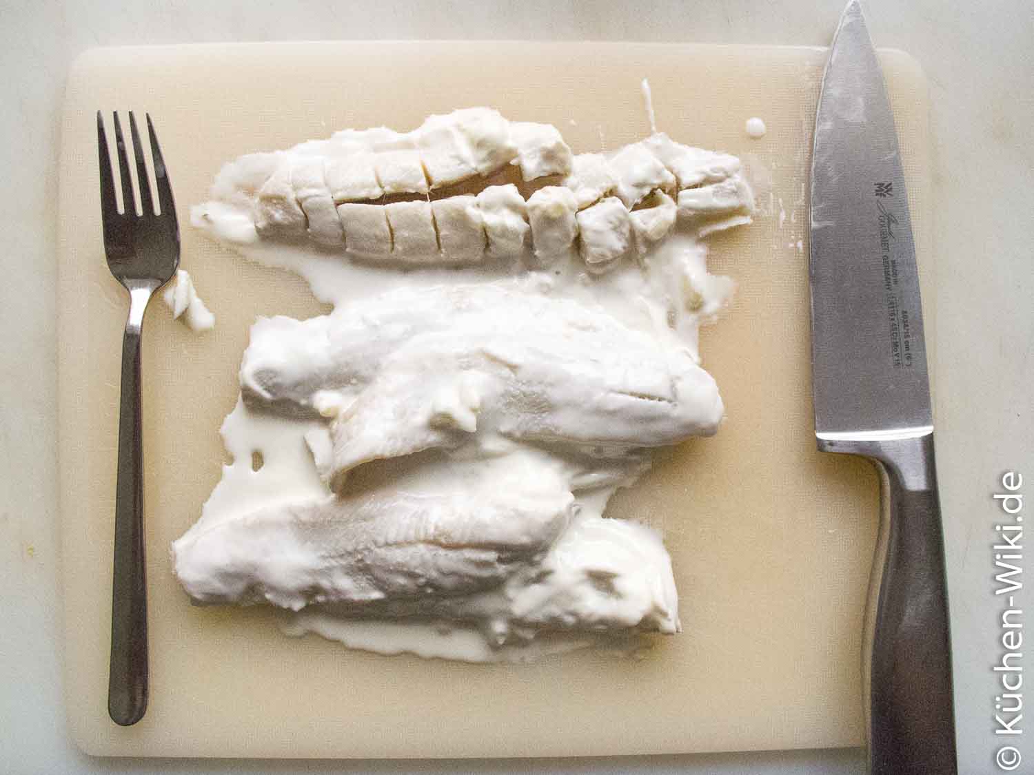 Den Fisch schneide ich immer entlang der Mittelnaht durch und stückel dann die halben Filets.