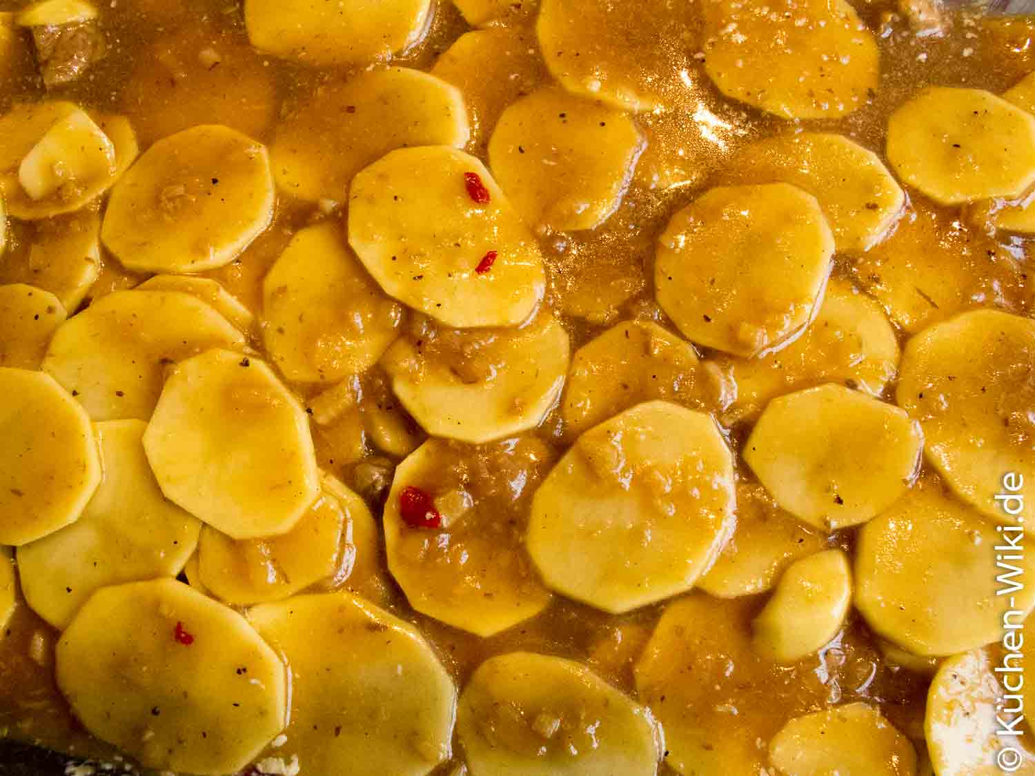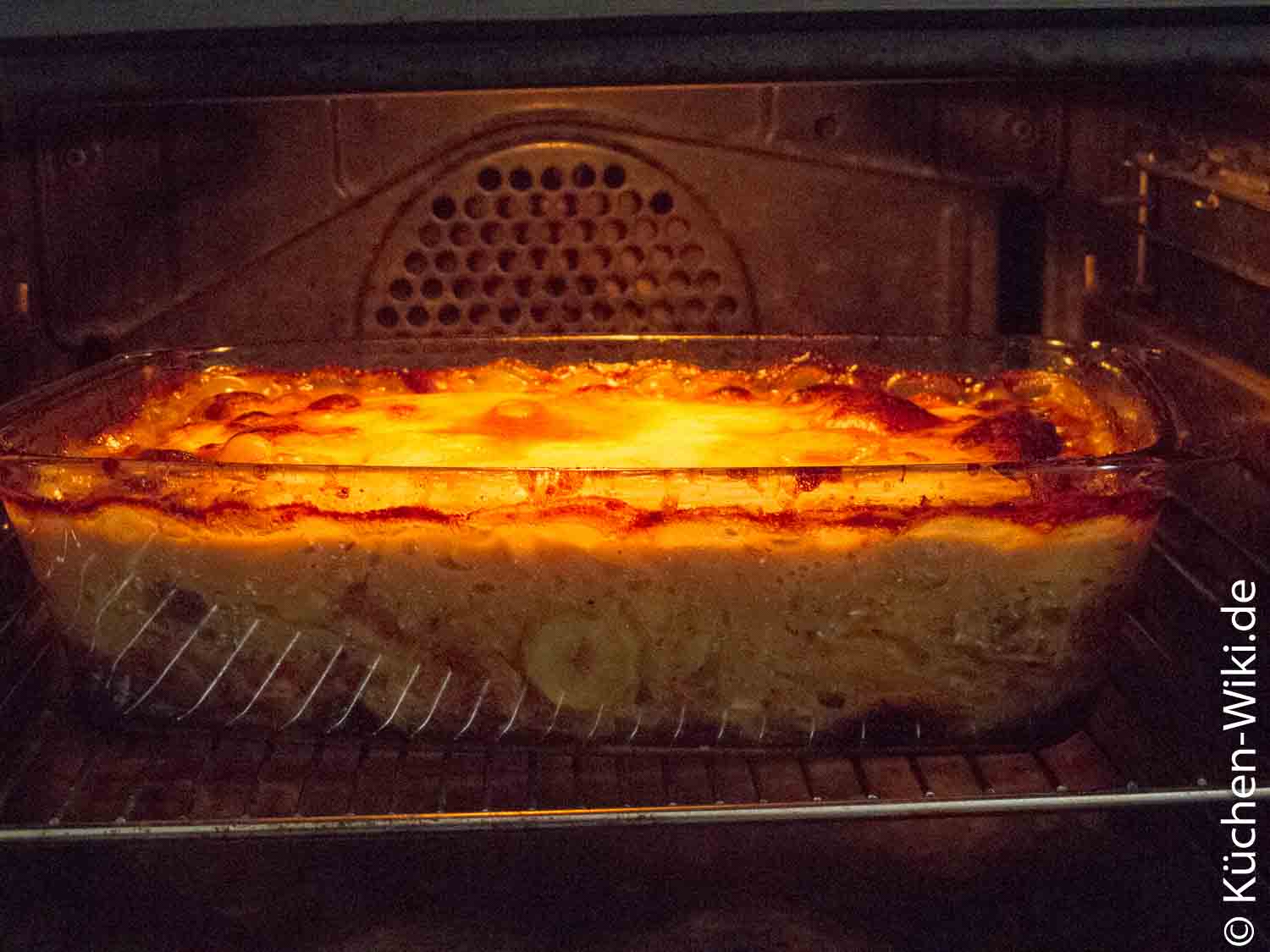 Die Lösung: Kartoffelstärke verändert sich bei einer Temperatur von 62,5°C [1]. Dieses Zeitfenster benötigt deine Kartoffelscheibe um Wasser zu binden, was sie essbar macht. Warum das nun für dein spanisch Frikko ein Meilenstein der Erkenntnis ist? Jede Kartoffelscheibe benötigt mindesten diese Temperatur über ein Zeitfenster von 15-20 Minuten um gar zu werden. Jede meint hier sowohl die Kartoffelscheiben in deinem spanisch Frikko am Rand, als auch die in der Mitte der Auflaufform. Damit nun die Kartoffelscheiben in der Mitte überhaupt warm werden können muss sich die Flüssigkeit drum herum erst einmal erhitzen. In der praktischen Anwendung ginge nun folgendes: Ein Garthermometer mittig in das spanisch Frikko stecken und bei einer Kerntemperatur von 80° C mindesten noch 20 Minuten weiter backen. Ohne Garthermometer empfehle ich eine Garzeit von mindestens 120 Minuten.