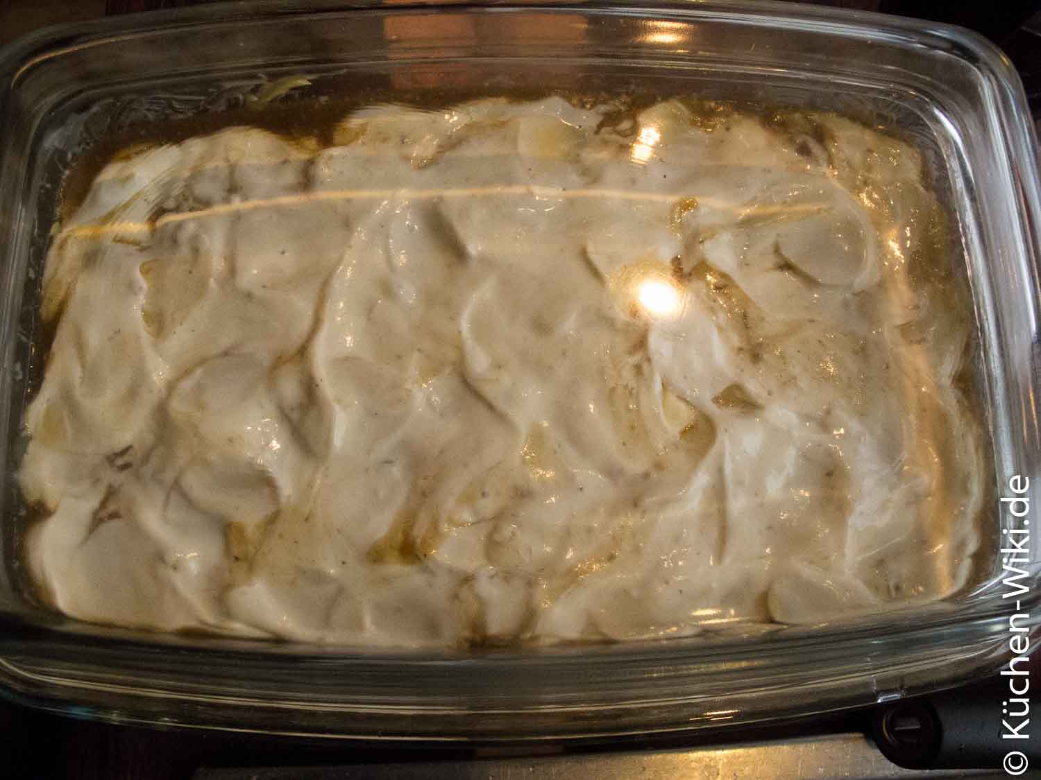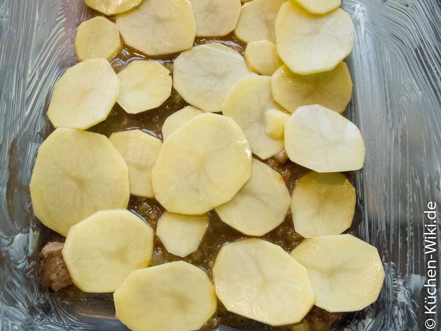 Mehr Flüssigkeit … und die dann andicken! Ich hab bei dem spanisch Frikko so viel Flüssigkeit zugegeben das Fleisch und Kartoffeln komplett darin geschwommen sind. Natürlich hab ich da in der Auflaufform keine Suppe draus gemacht! Aber ich hab auf jede Schicht Kartoffeln und Fleisch einen Ordentlichen Schlag Flüssigkeit gegeben. Damit mir nicht alles weg schwimmt hab ich die Sauce mit einer Mehlschwitze angedickt. Nach dem Schichten hab ich das ganze spanisch Frikko noch mal mit beiden Händen runter gedrückt so das der Flüssigkeitspegel deutlich über den Kartoffeln war.